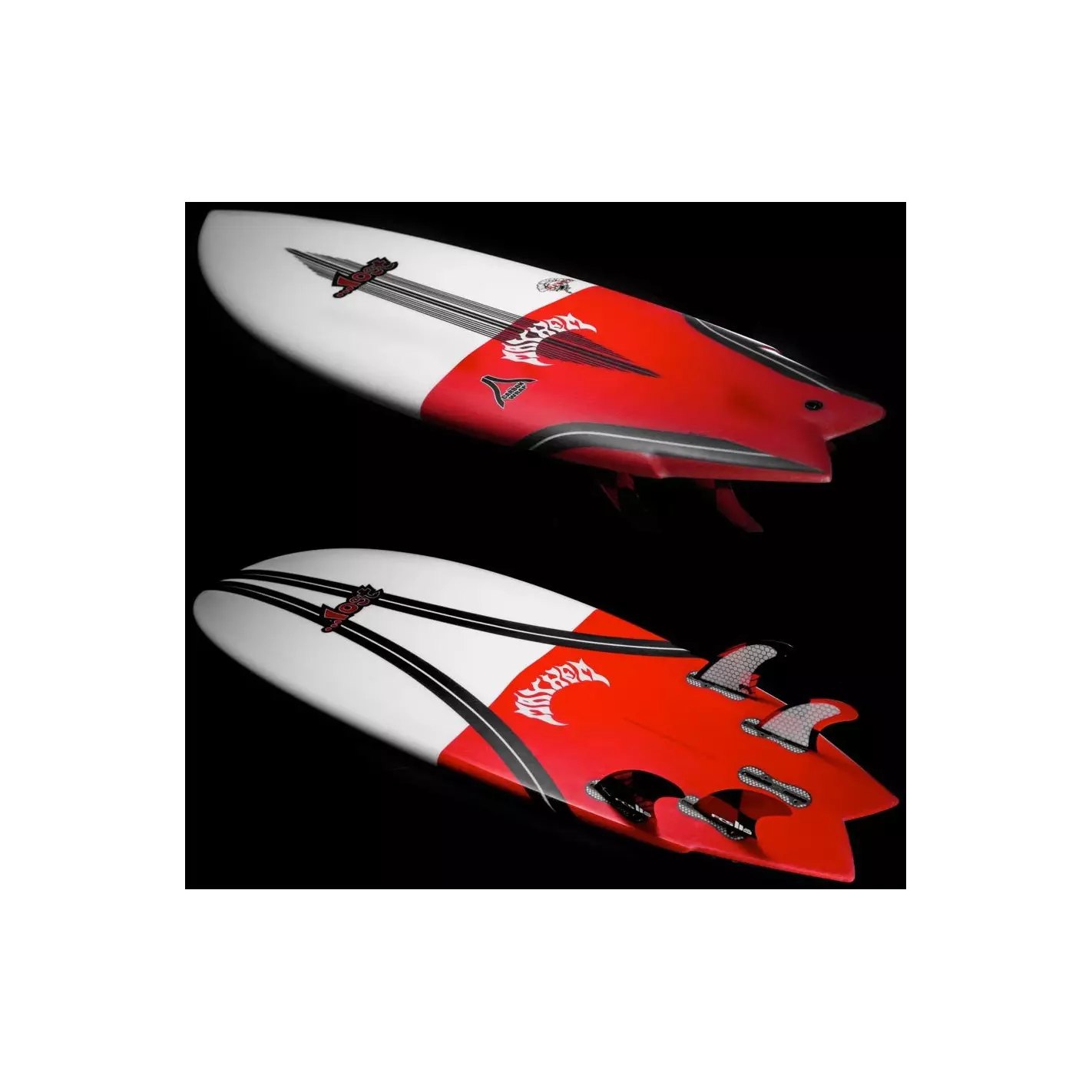The Carbon Wrap technology makes light, fast, responsive and robust boards. The stringer has been replaced by carbon straps in the EPS core. The straps start on the nose to the sude of the hull and finish on the tail. They create flex which provides speed and drive. The board is then laminated with epoxy resin and bi axial fiberglass.