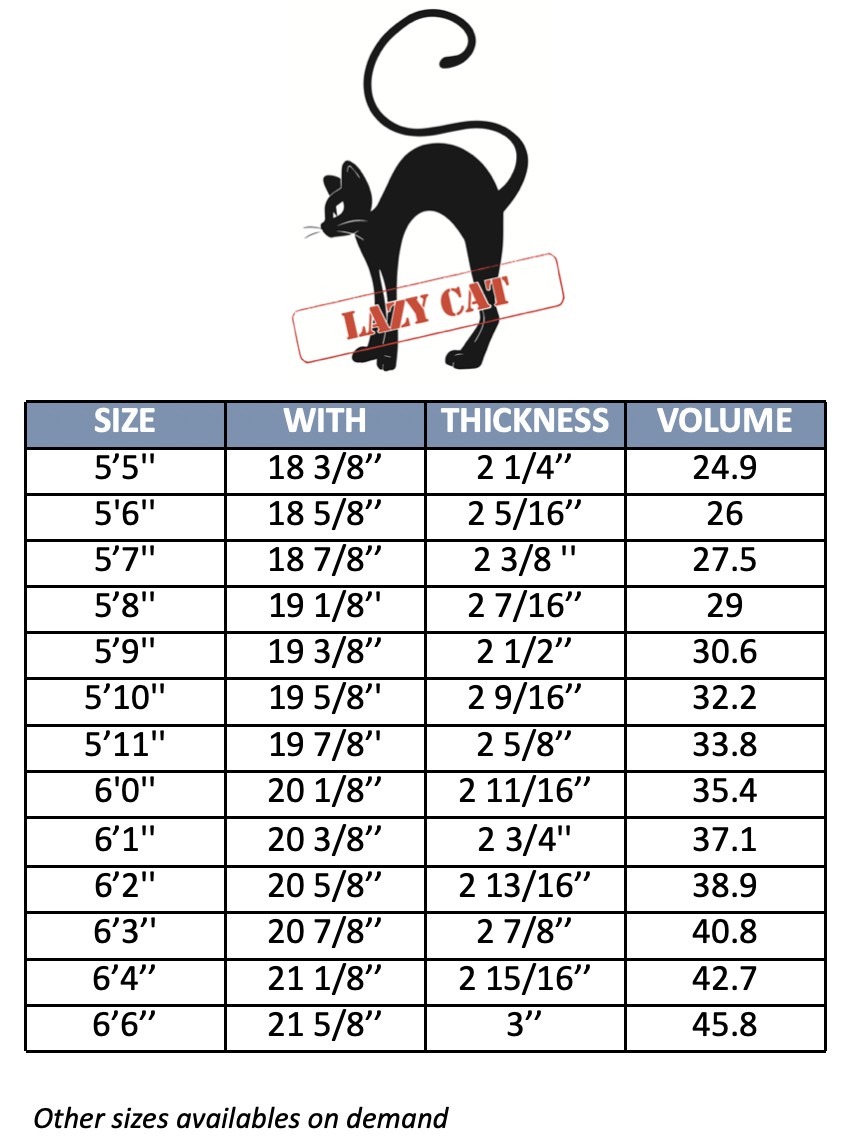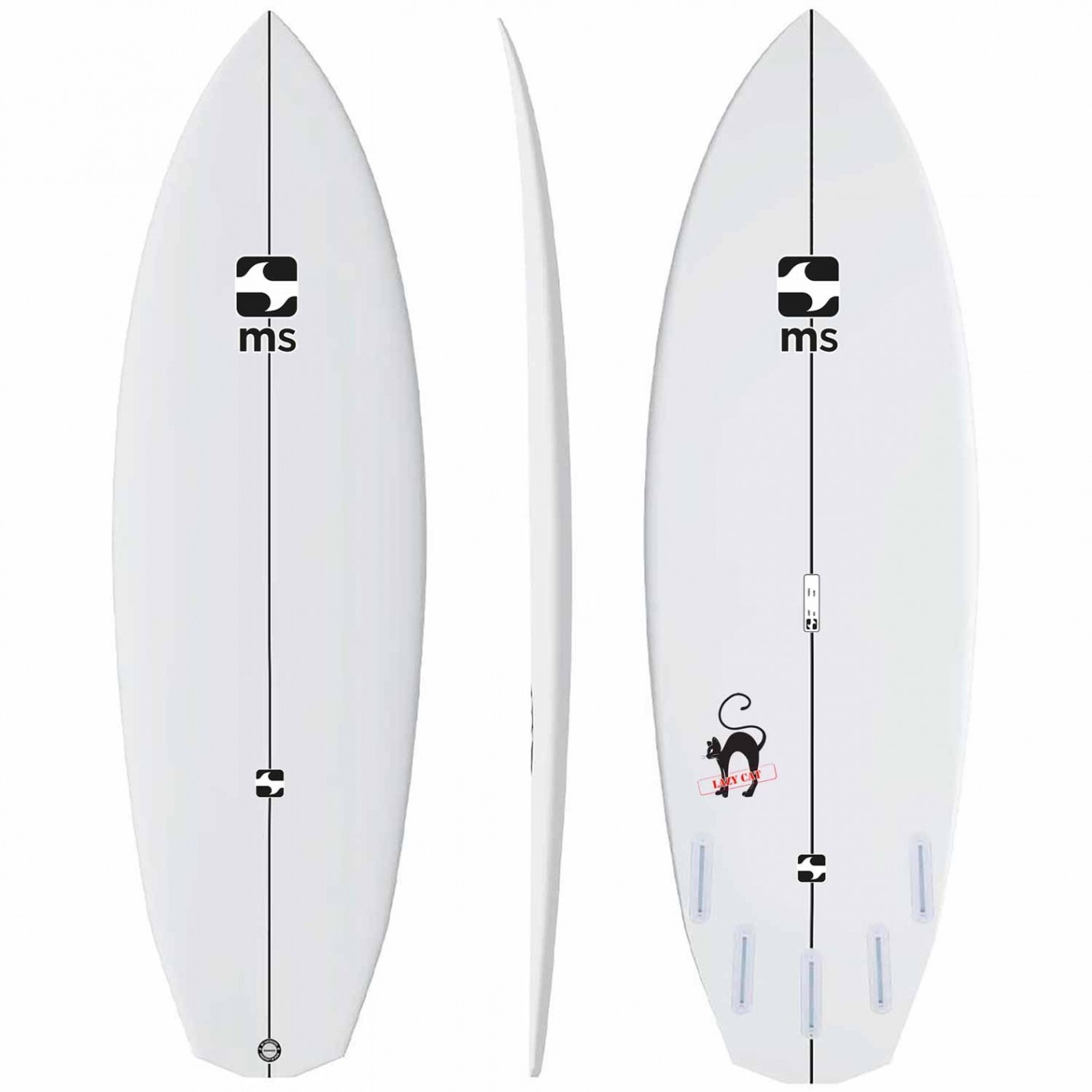 The MS Lazy Cat is a short and hybrid board with modern shape. Small rocker, large outline and diamond tail. Easy to paddle with and fast.