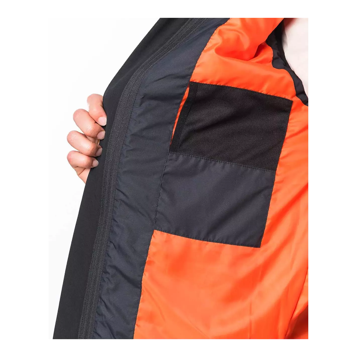 The inner jacket connects to the outer jacket. In addition, it is equipped with a chin guard, an adjustable hood and is reinforced with a DWR treatment.