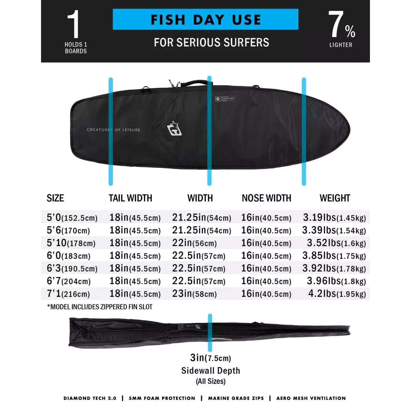 La funda Creatures Creatures Day Use Fish DT2 es perfecta para tu tabla de surf tipo Fish, con gran capacidad, funcionalidad y resistencia. Todo ello con los mejores acabados que nos ofrece siempre Creatures.