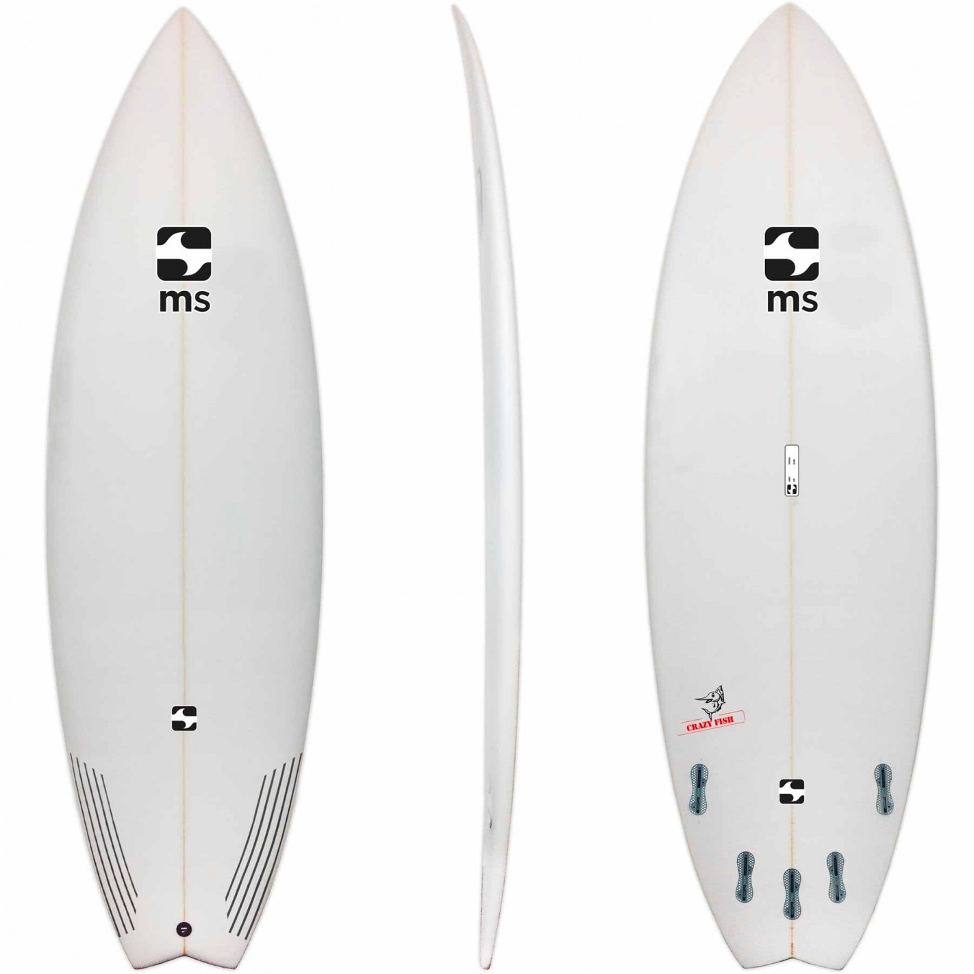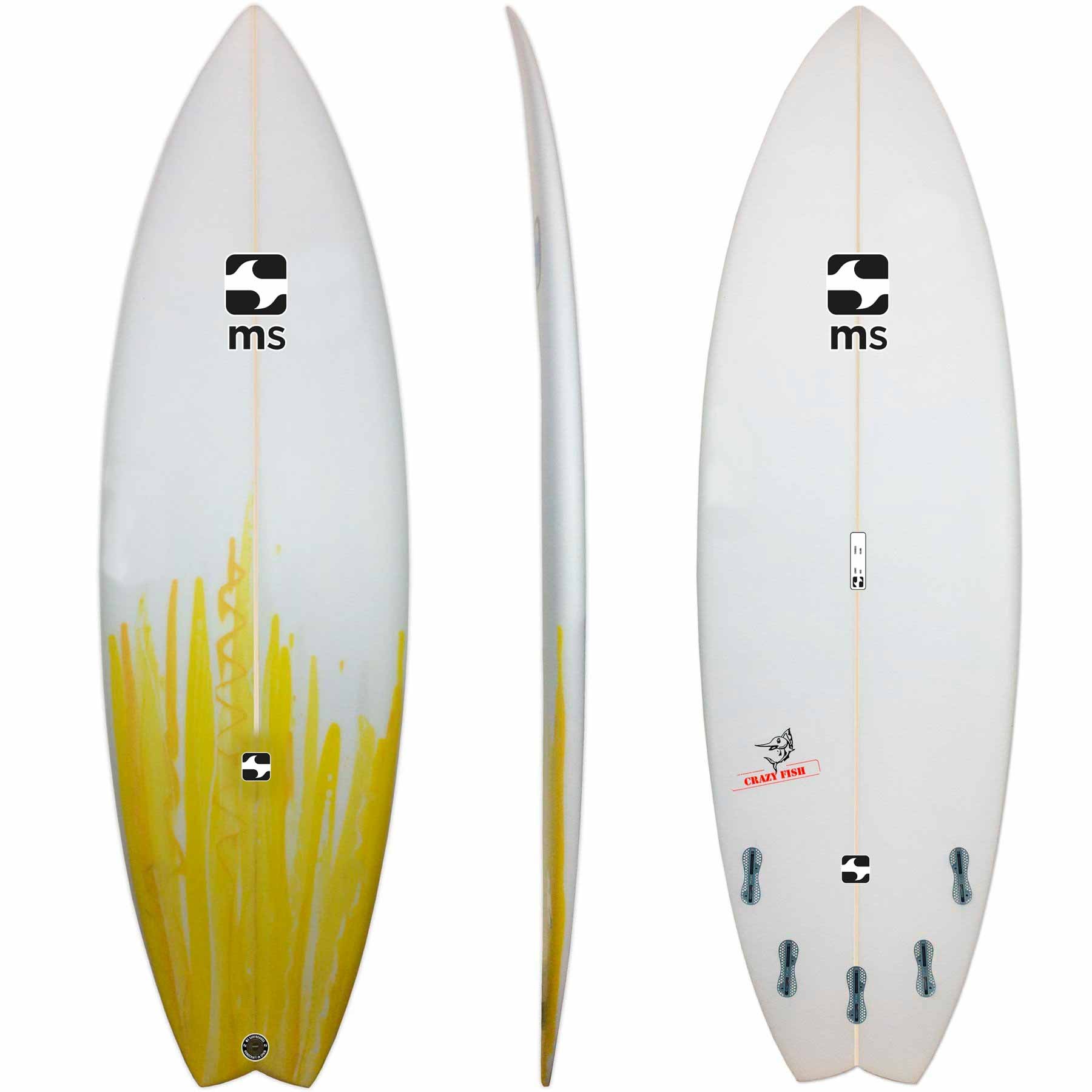 La MS Crazy Fish es una tabla de surf con un outline de shortboard, pero mas ancha, con cola de golondrina, y con un cóncavo profundó para generar velocidad en olas pequeñas o de poca potencia.