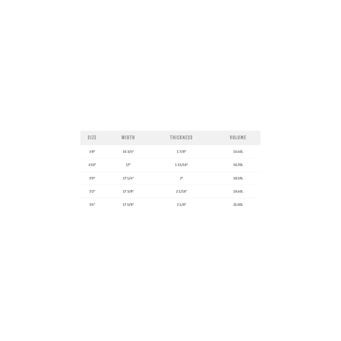 Disponible en configuración Tri-fin o tri-quad, con sistema de quillas FCSII o Futures, en 5 tallas  desde 4'8'' hasta 5'4'', o bien con medidas personalizadas.