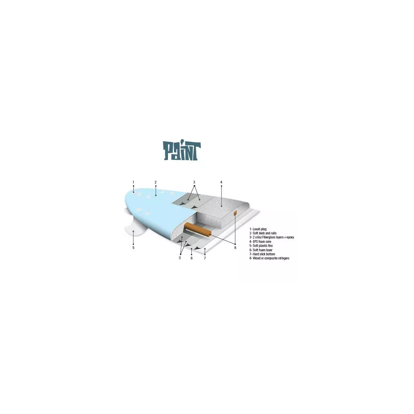 PAINT-TECNOLOGY: Combina un alma de EPS con dos stringer, una laminación epoxy/fibra de vidrio, un slick de PE en el bottom y una lamina de espuma en el deck. El resultado es una tabla Soft Board increíblemente robusta.
