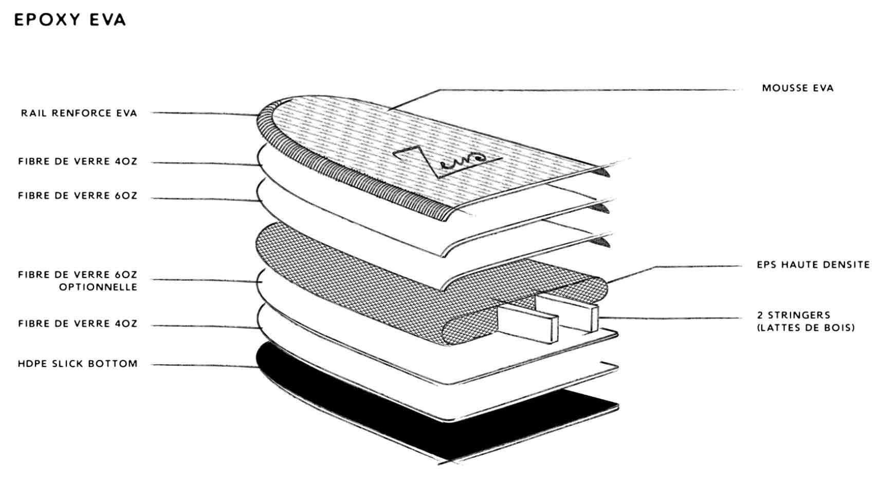 Combina un alma de EPS con dos stringer, una laminación epoxy/fibra de vidrio, un slick de PE en el bottom y una lamina de espuma en el deck. El resultado es una tabla Soft Board increíblemente robusta.