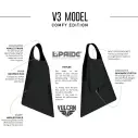 Les palmes de bodyboard Pride Vulcan V3 sont environ 10% plus rigides que les Vulcan V1 et V2, ce qui augmente leurs performances. Pour éviter de sacrifier le confort, elles ont une bande de néoprène à l'intérieur, et la bande arrière a été redessinée pour être plus ergonomique.