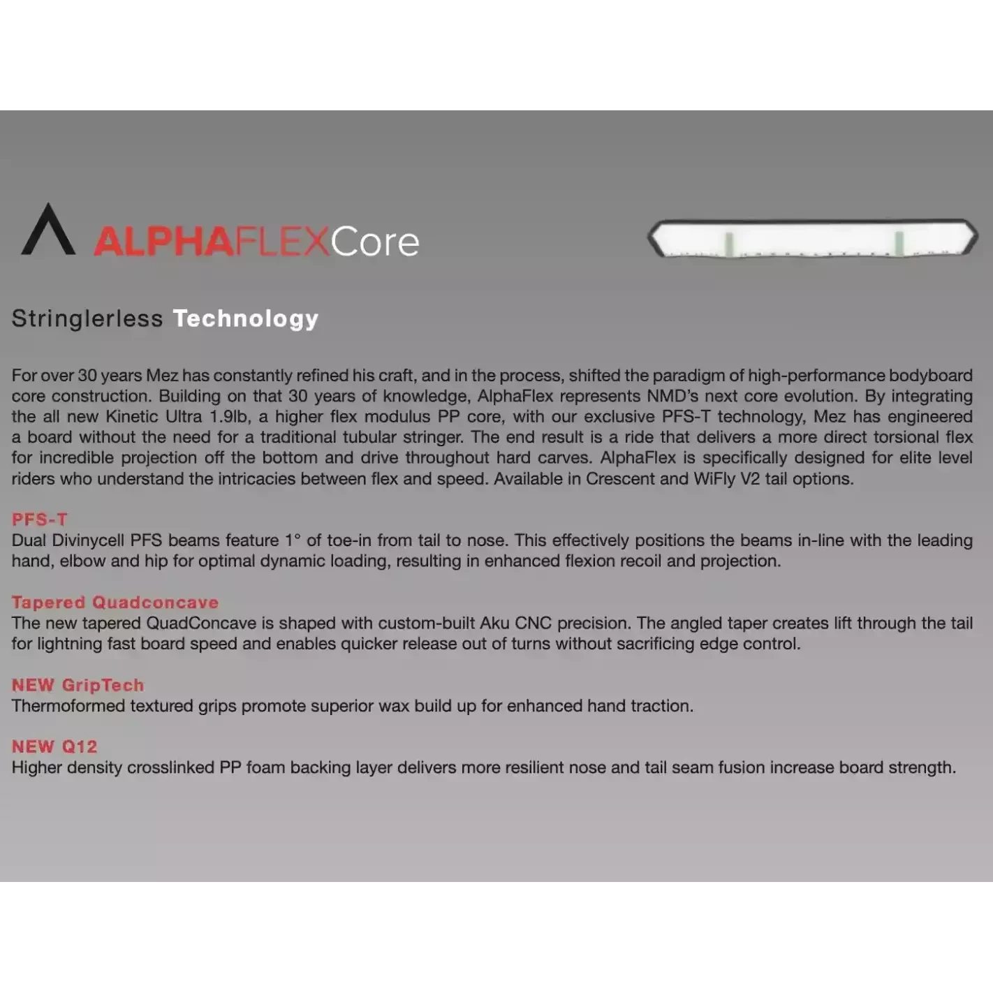 L'une des caractéristiques les plus remarquables de cette planche est l'AlphaFlex, qui élimine le besoin du stringer tubulaire traditionnel, permettant une flexion torsionnelle plus directe. Cela se traduit par une projection incroyable dès le bottom turn, idéale pour les riders qui cherchent à exploiter leur vitesse et leur maniabilité à chaque vague. L'AlphaFlexest spécialement conçu pour les bodyboardeurs expérimentés qui comprennent l'importance d'équilibrer flexion et vitesse pour des performances optimales.