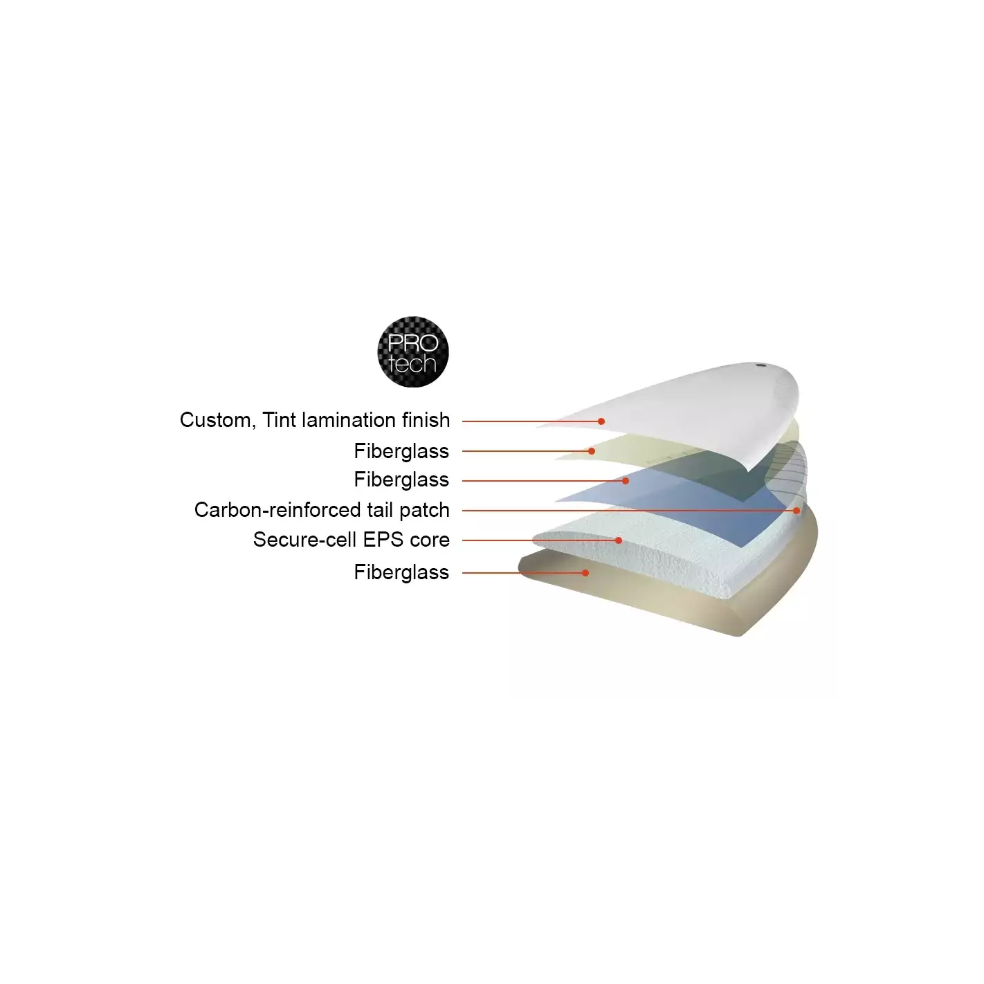 Les planches fabriquées avec la technologie Protech époxy ont un noyau en mousse polystyrène, fibres de verre laminées avec de la résine époxy, renforts carbone au niveau du tail, et une finition en peinture mat. Le résultat est une planche de surf en époxy légère, résistante, à un prix incroyable.