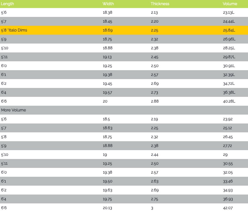 Disponible en configuration Tri-fin, avec système d'ailerons FCSII ou Futures, en 11 tailles de 5'6'' à 6'6'', ou avec des mensurations personnalisées.