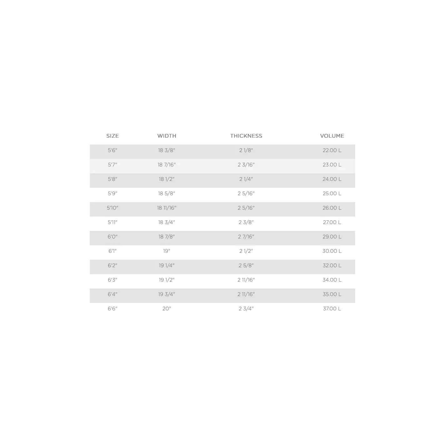 Disponible en configuration Tri-fin, avec système d'ailerons FCSII ou Futures, en 13 tailles de 5'6'' à 6'6'', ou avec des mensurations personnalisées.
