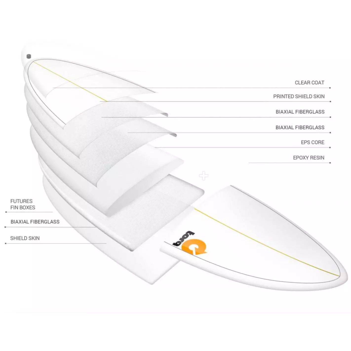 La tavola da surf TORQ ha una costruzione epossidica, con un'anima di polistirolo espanso, fibre di vetro bi-assiale laminate con resina epossidica e una pelle in plastica PVT. Il risultato è una tavola da surf di resina epossidica leggera e molto resistente ai piccoli urti di tutti i giorni. Le tavole TORQ hanno il sistema di fissaggio delle pinne Futures fins .
