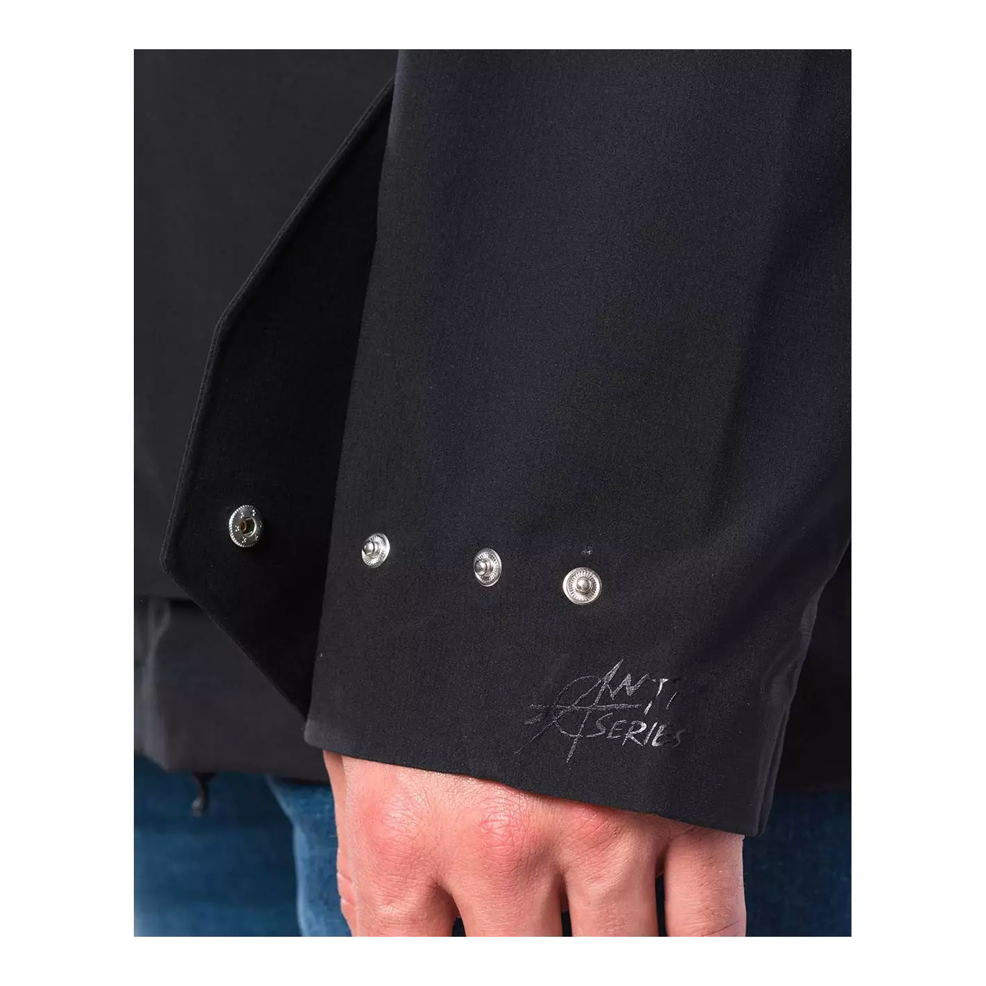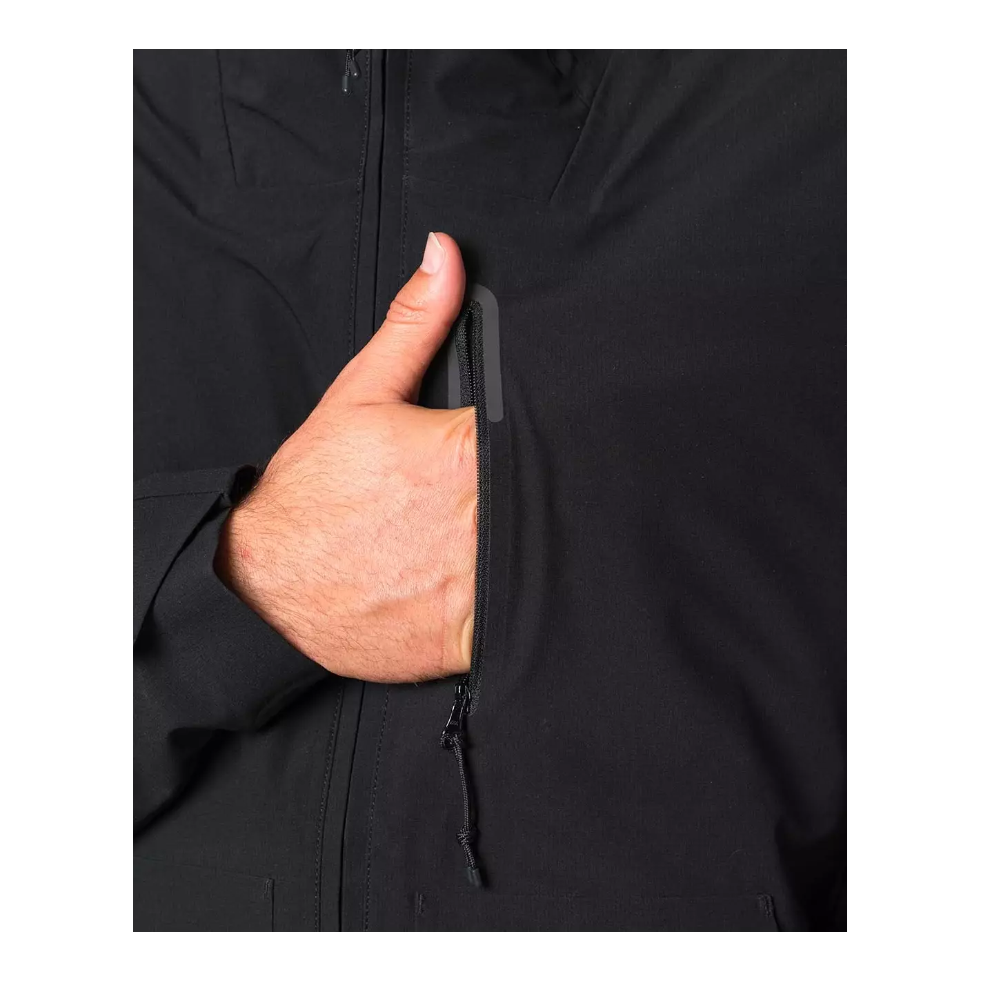 De binnenmantel sluit aan op de buitenmantel. Daarnaast is hij uitgerust met een kinbescherming, een verstelbare capuchon en is hij verstevigd met een DWR-behandeling.