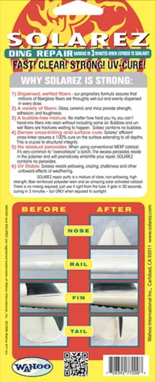 Sinds 1987 is SOLAREZ het referentie polyester hars reparatieset voor surfplankreparaties. Het is een mengsel van heldere, niet-vergelende, hoogwaardige polyesterhars, versterkt met glasvezel, en een zon-geactiveerde katalysator. Geen menging vereist, het kan rechtstreeks uit de tube worden gebruikt. Het gelt in 30 seconden, hardt uit in 3 minuten, maar ALLEEN wanneer het wordt blootgesteld aan zonlicht. Het gepatenteerde formule zorgt ervoor dat miljoenen glasvezels volledig doordrenkt en gelijkmatig verdeeld zijn in elke dosis, met een bubbelvrije menging.