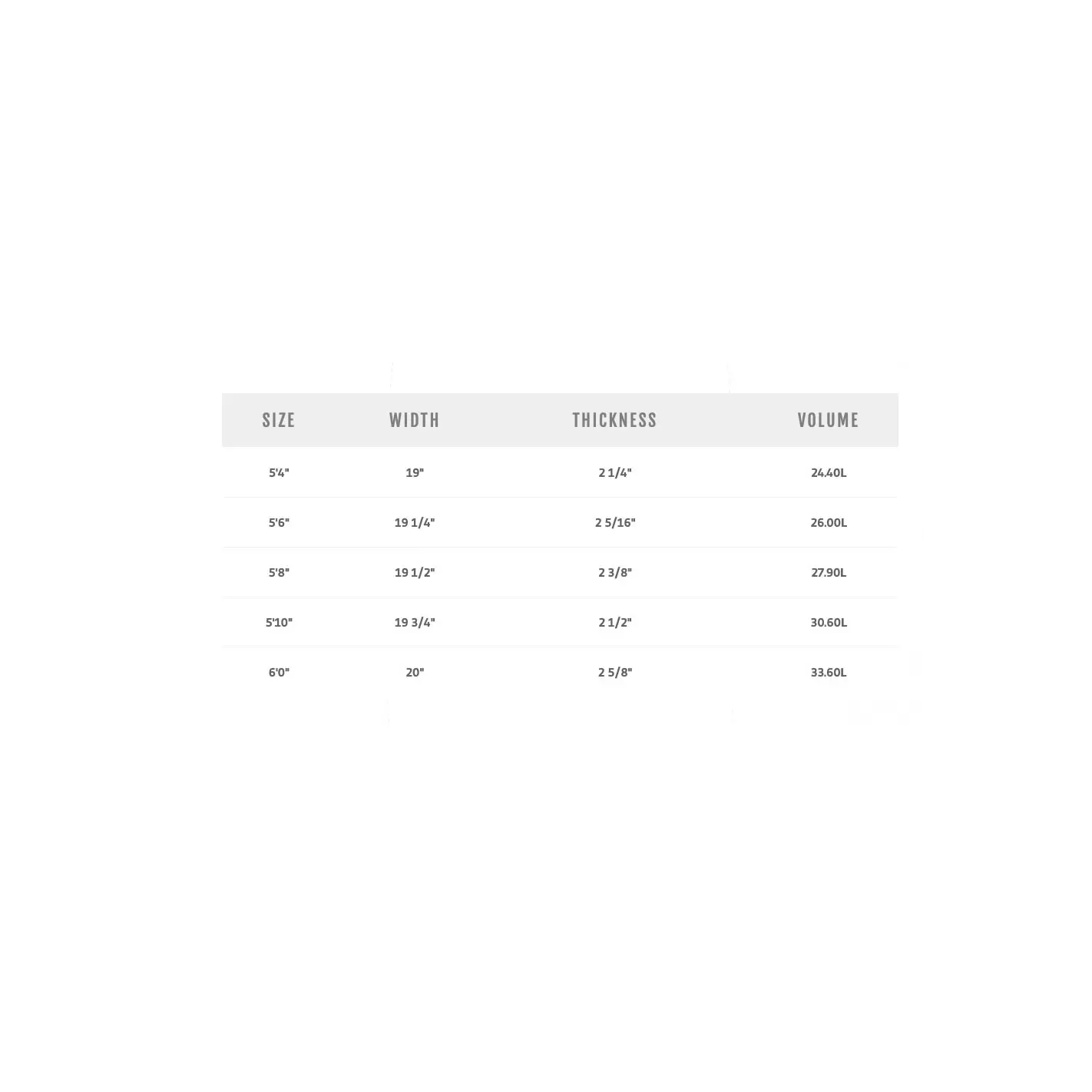 Verkrijgbaar in Twin fin configuratie, met FCSII of Futures vinsysteem, in 5 maten van 5'4'' tot 6'0'', of met aangepaste afmetingen.