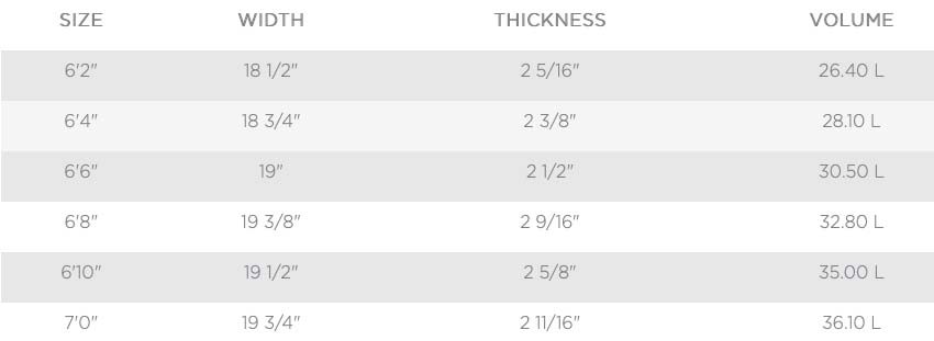 Disponível na configuração Tri-fin, Quad ou Tri-quad com sistema de quilhas FCSII ou Futures, em 6 tamanhos de 6'2" a 7'0'', ou com medidas personalizadas.